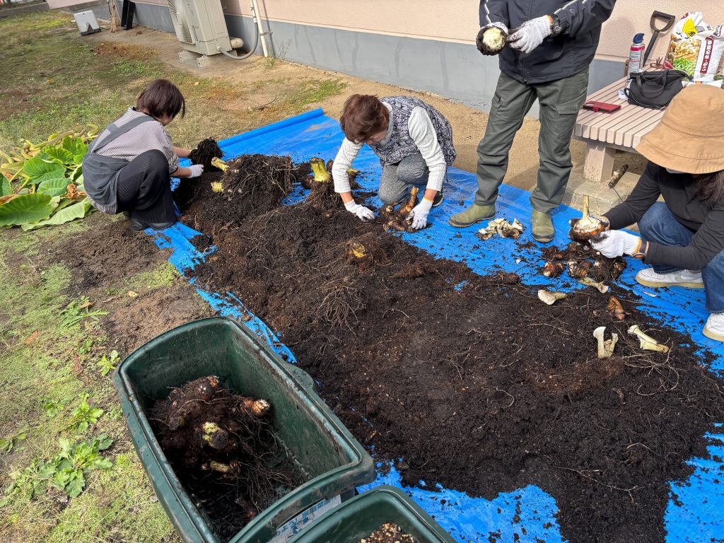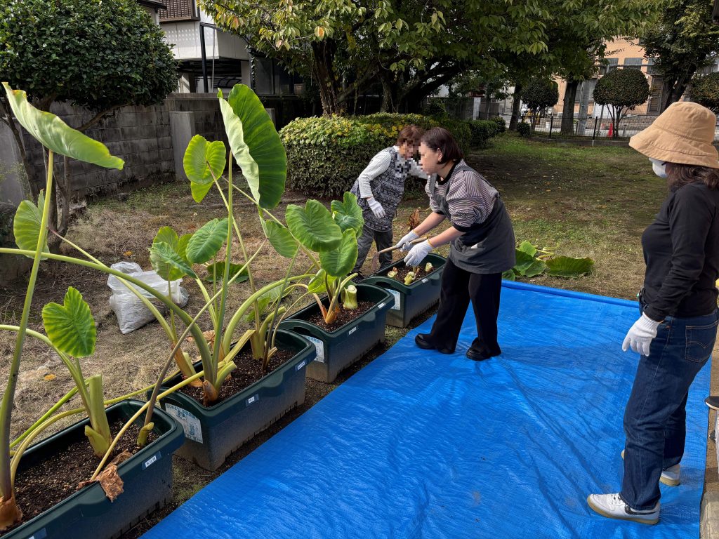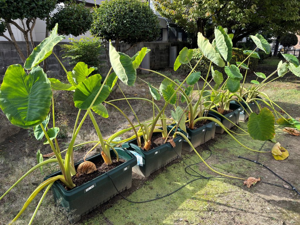 【2025年10月27日】 朝夕の気温に本格的な秋の到来を感じる季節。当館の里芋は植え付けから5か月が経ちました。茎が倒れ、葉も黄色に変化しついに収穫が近づいてきました。