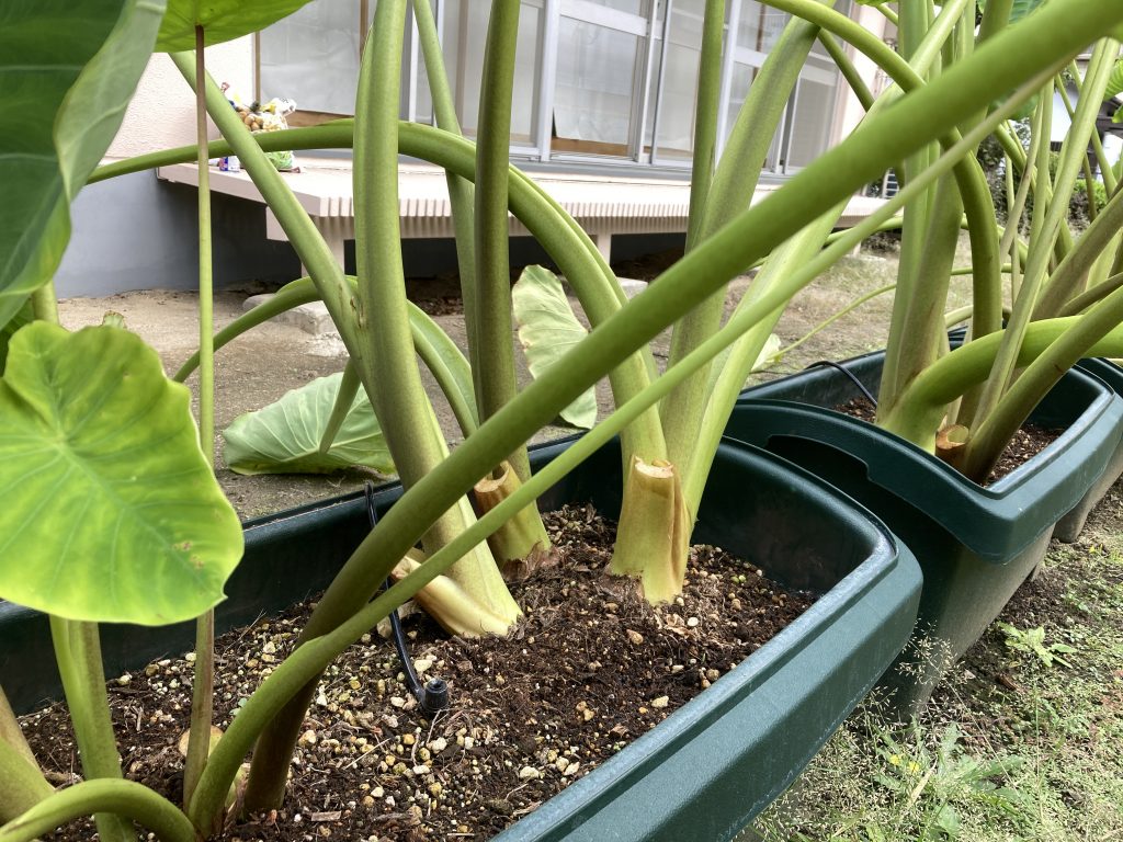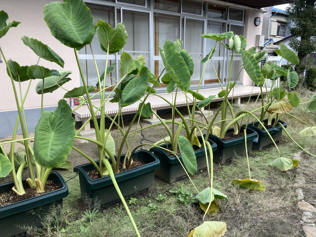 【2025年10月27日】 朝夕の気温に本格的な秋の到来を感じる季節。当館の里芋は植え付けから5か月が経ちました。茎が倒れ、葉も黄色に変化しついに収穫が近づいてきました。